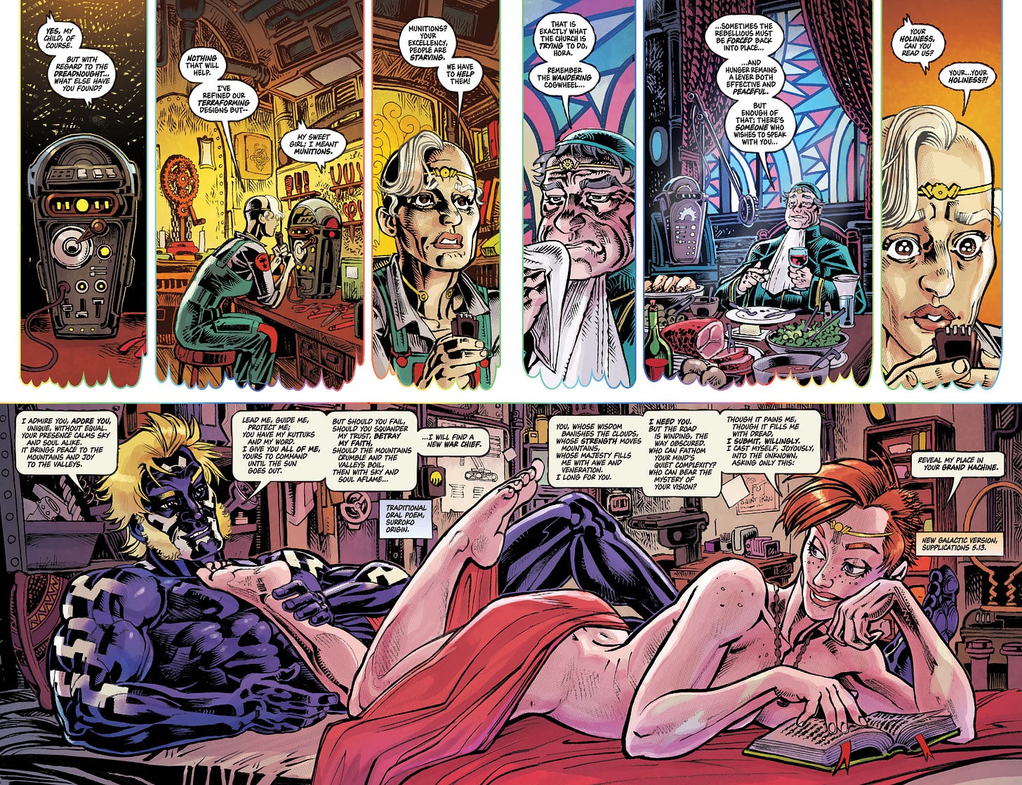 To address this problem, I make a special effort to use the comics medium beyond just depicting a scene, such as through diagrams, cutaways, graphs, maps, etc. Another technique that has become a signature Free Planet move is to run two scenes concurrently across a single spread, such that readers can’t help but discover parallels and contradictions. In pages 16 and 17 above, both scenes explore loyalty and devotion, through the overlapping lenses of religion and romance. Further blurring those lines and creating the ambiguity that is essential to serious fiction is the fact that both Keen and Fweha are quoting other intradiegetic texts, lending additional complexity to the reader’s interpretation. And finally, at the risk of burying the lede: Jed’s characters are all profoundly, astoundingly good looking.