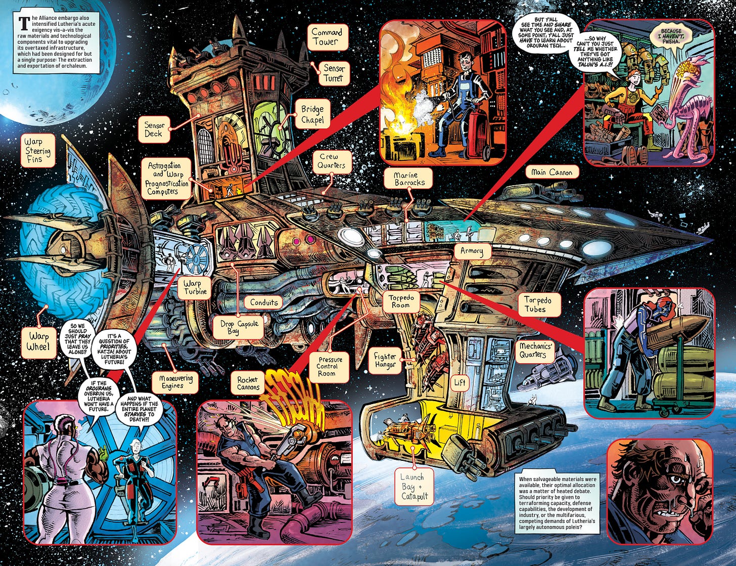 In Free Planet #9, this approach is perhaps best exemplified through the cut-away spread above. Jed deviled in the detail here but none of it is incidental or random; the labeled Orouran dreadnought is designed to further flesh out facts only hinted at previously while also establishing events still to come in subsequent issues. But what elevates the spread from a cool cutaway to complex, novelistic comics is how the diagram interacts with the inset panels and historical captions. This issue—like every issue—demands to be spread out on a table and pored over and, once you do, you’ll be rewarded with added understanding and thematic depth, particularly around Josef, the big dude with the wrench.