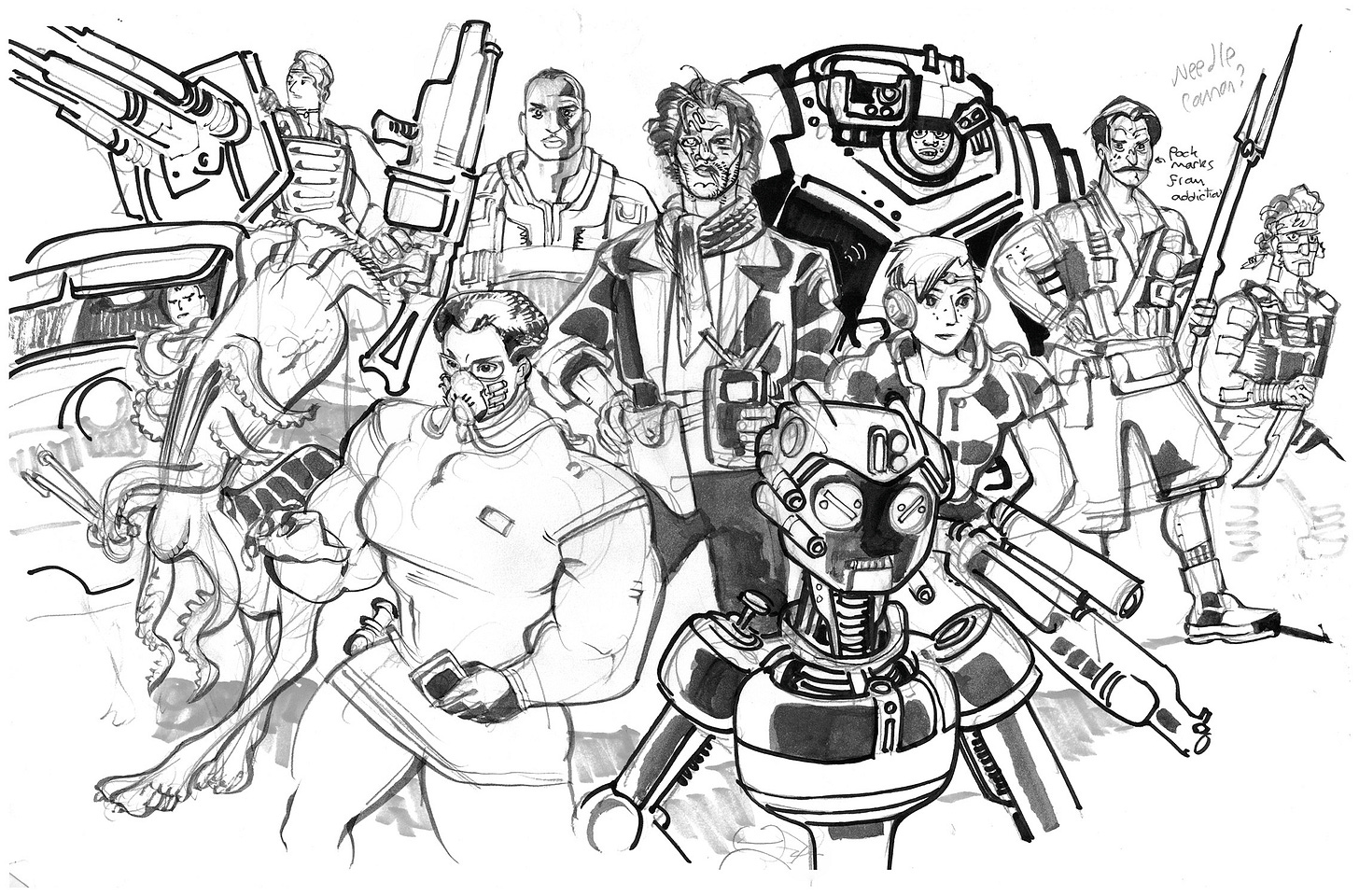 Often, creators will hammer out a narrative and then develop characters and the world around it. For Free Planet, Jed and I built an entire world and fleshed out a complete cast of characters, from which narrative would arise organically. To kick off Jed’s character design process, I provided him with descriptions of amalgamated archetypes from history and 1960s prose science fiction: The guerrilla hero, the zealots, the robot, the savage, the leader, the scientist, the battlesuit, the alien, the good soldier, the terrorist. Head over to Jed’s Patreon to see his earliest stabs at figuring out who these people are and do yourself a favor: Subscribe while you’re there.