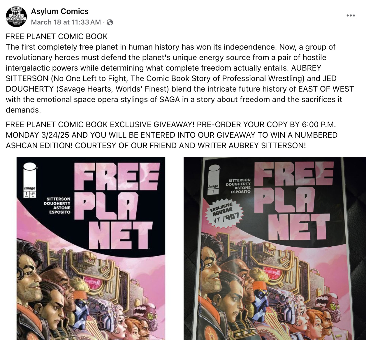 There are only 407 Free Planet #1 ashcans in existence; I know because I hand-numbered them myself. Because Free Planet is a book that must be experienced in the print, periodical format, I gave our ashcans out at ComicsPro and sent them out to the comic shops have supported me most over the years. While the Free Planet #1 ashcan has been commanding impressive prices on eBay, some shops – like Asylum Comics in El Paso, Texas – have set up giveaways this extremely rare copy of Free Planet #1. Ask your local comic shop whether they received a Free Planet ashcan and how you can get your hands on it!